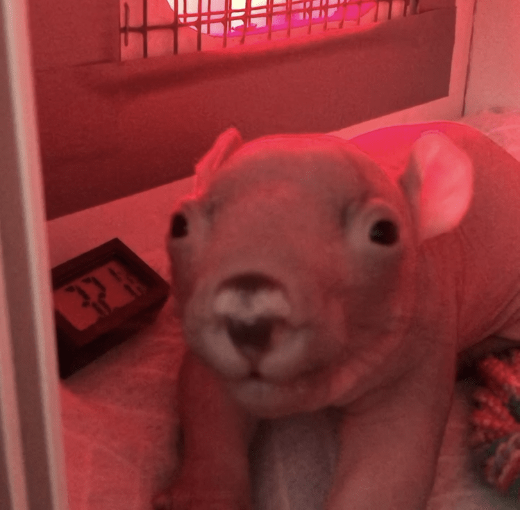 But that wasn’t the end of her problems! One afternoon Elsie was taken outside – carried in her pouch – in the winter sun for less than 3 minutes… when she had a huge reaction to sunlight! Her skin broke out and turned bright red wherever the sun hit her delicate skin. After a hasty retreat back indoors, her skin return to normal colour. Perhaps joeys at this age never see sunlight or perhaps the formula they are fed in care is lacking some vitamin. Luckily she has a long journey to release and plenty of time to get used to sunlight.