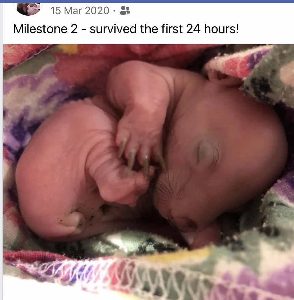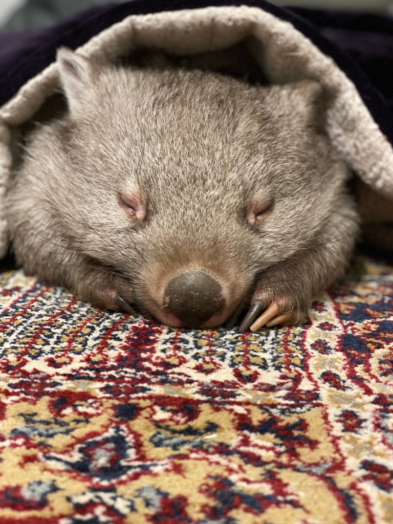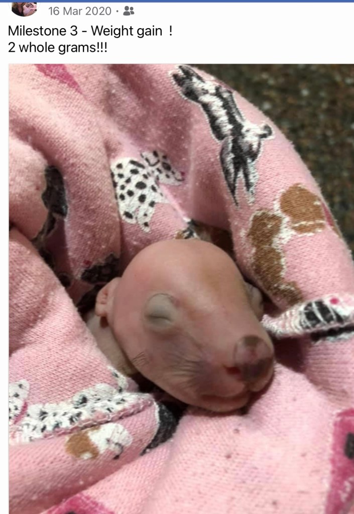 One year ago today – on the 14th March 2020 – a joey wombat was delivered to my house (see my first post). Little Elsie had been found in her dead mum’s pouch. She weighted just 120 grams, was dehydrated and a fetus! Those first few hours establishing her care – setting up the humidicrib and getting her to accept a bottle were the most stressful hours I think I’ve ever had!