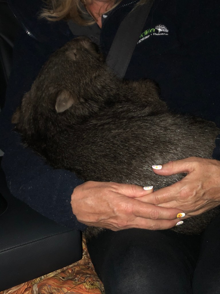 Baby wombats in the wild make a loud hissing noise when they are scared or separated from mum. I could hear Barney making this noise in his crate as soon as he was handed over to me! Had me been calling out for me the whole time he was at the vet? I placed Barney (who was still in his crate) in the cargo section of my SUV and drove off. Luckily my husband was driving because suddenly there was a thud! There we were … at a set of traffic lights, in the rain, on a busy Saturday night, with Barney still hissing – but now he was standing on his hind legs looking out of the back window of my car after he’d smashed his way out of his crate! Now what a photo that would have been! But I was too stressed to take one! I also couldn’t jump out at the traffic lights, stand in front of the cars behind us and try to wrangle a wombat from the cargo hold of my car! So as the lights turned green, I took off my seat belt, climbed into the back seat, reached over into the cargo hold and dragged a 12.5 kilo hissing, stressed wombat over into the back seat and onto my lap.
